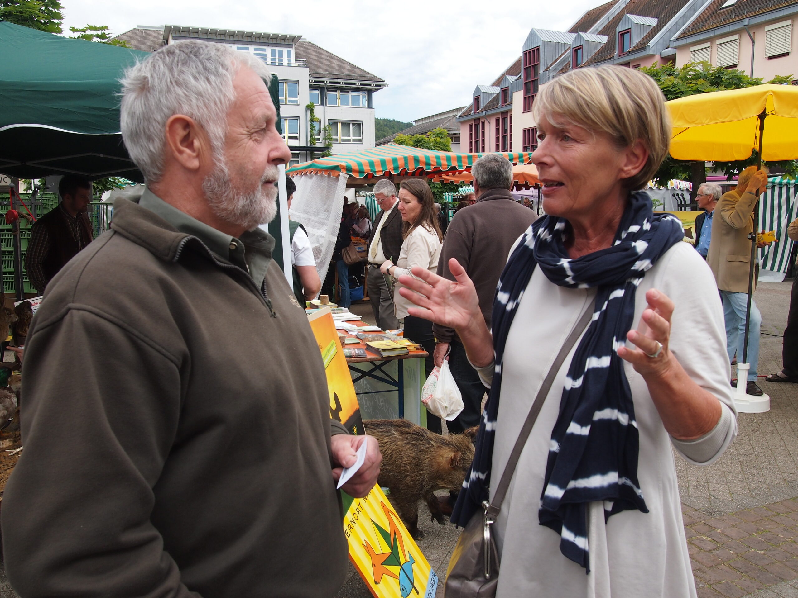 Bild: (mh) Das Bild zeigt den ehemaligen Hegeringleiter Wilhelm Blask mit MdL Charlotte Schneidewind-Hartnagel vor dem Stand des Hegerings auf dem Leopoldsplatz in Eberbach